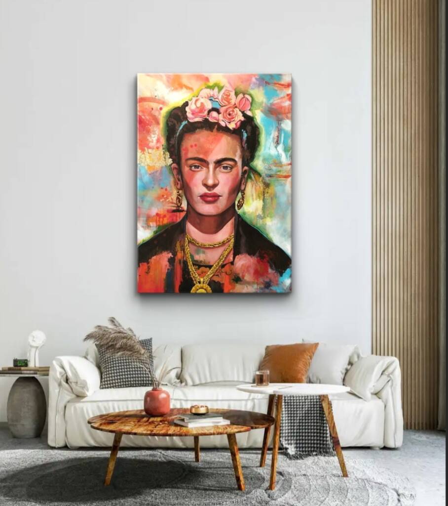 Esta obra impactante rinde homenaje a la fuerza, sensibilidad y legado de la icónica artista mexicana Frida Kahlo. Con una paleta vibrante y detalles florales que adornan su cabello, la pieza fusiona elementos tradicionales con técnicas contemporáneas, creando una representación poderosa y evocadora.
