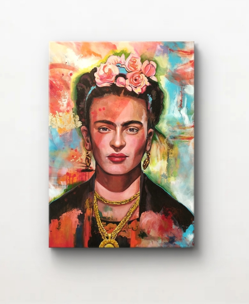 Obra de técnica mixta sobre lienzo que forma parte de la serie Mujeres Doradas. Representa a Frida Kahlo con elementos florales y dorados, en una composición vibrante que celebra su legado artístico.